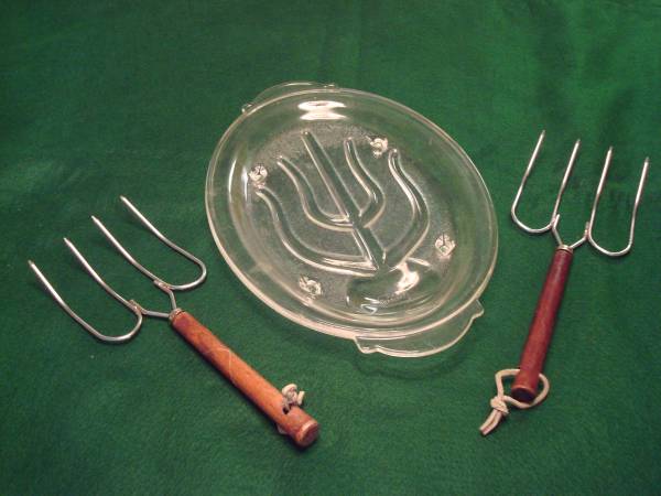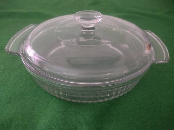 Ovenware and Microwave Dishes: Glass Dish Fire King Pie Pan, 9" - $3 Glass Pyrex Dish Pie Pan, 10" - $3 Ribbed Glass Anchor Hocking 1 quart casserole Dish with handles and Lid - $7 GlasBake Meat...
