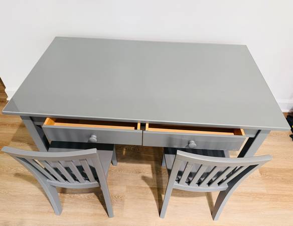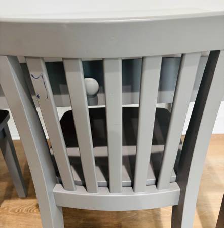 Pottery Barn Kids grey wood Carolina craft table and two matching chairs. Table equipped with 2 drawers for accessible storage. Durable smooth surface is easy to clean. Removable clear acrylic play mat included to protect table surface. Accommodates paper roll (sold separately). VGUC- minimal marks noted on back of chair as shown in picture
