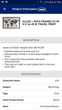 Brand New Allen and Roth World Map Art See pictures for full specs and description. Pick up in Halethorpe or meet in Arbutus, Catonsville, Glen Burnie, Severn. Please check out my other listings....