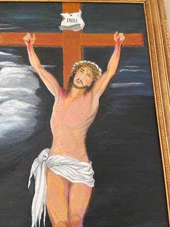 Original Large painting of Jesus on the Cross. Material: White primed canvas. Medium Used: Acrylic. Measurements: Approx 4' x 3' Gold frame included. Ready to hang. Cash and pick up only. From a pet...