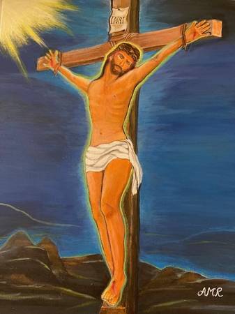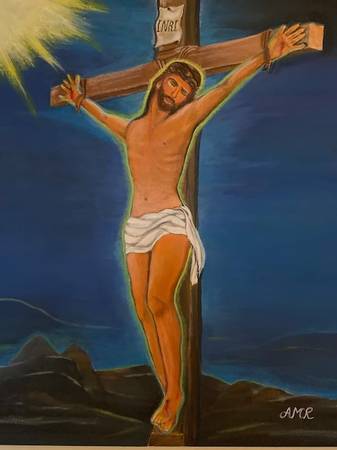 Original painting of Jesus on the Cross with blue background. It comes with a gold frame measuring 18" x 21" Material: Canvas primed in white. Paint Used: Acrylic. From a pet and smoke free home....
