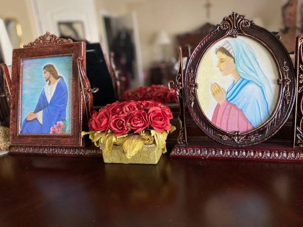 The square frame has Jesus painting in acrylic.