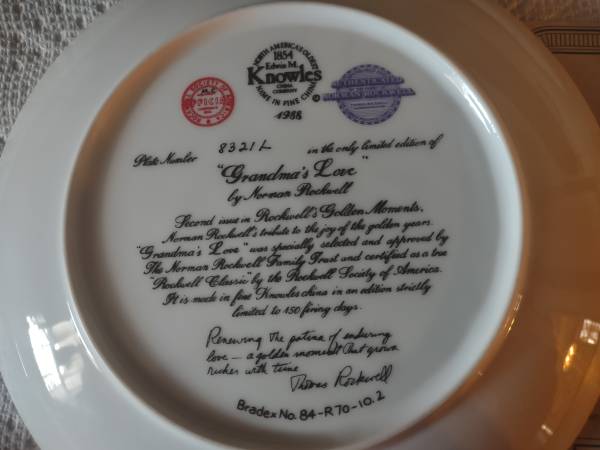 Norman Rockwell “Grandma's Love” - second plate in the limited edition Rockwell's Golden Moments collection. Limited Edition. Plate Number 8321L. Includes Certificate of Authenticity. Issued with the full consent and cooperation of The Norman Rockwell Family Trust. And officially endorsed and certified as a true Rockwell classic by the Rockwell Society of America. Issued in 1988 by The Edwin M. Knowles China Company North America's oldest name in fine china. Approx 8.5" diameter.