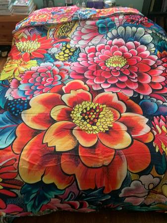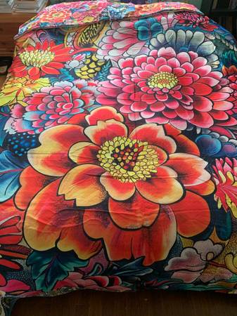 Bright-colored flower print bedspread and two pillow shams. The bedspread is 90" x 90" and the pillow shames are 30" x 20." The material is microfiber. Cash only.