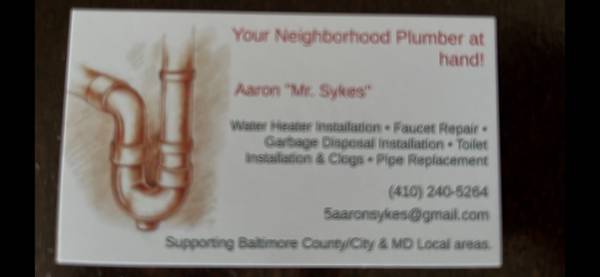 Your Neighborhood Plumber at hand! Aaron "Mr. Sykes" Water Heater Installation • Faucet Installation • Garbage Disposal Installation • Toilet Installation & Clogs • Pipe Replacement Supporting...