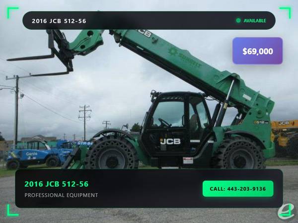 Picture 23: 2015 JCB 510-56 Capacity: Lift Time: 8.3 seconds Subcategory: Earth Moving and Construction Hours: 4,032 Serial: JCB5CGXGK02436835 Condition: Used Stock: 2504 Price: $69,000 2015 JCB 510-5610,000 lb capacity, 56' lift height, 4 wdr, 3 way steer, 48" fork carriage, 48" pallet forks, outriggers, aperture tires, Perkins diesel engine, 4,032 hoursThe first of our range to benefit from our wide set stabilizers. The high boom design allows for capacities of 10,000 pounds and a lift height of 56 feet. This model is ideal for masonry and framing applications and is a must for all rental fleets. This easy to operate telescopic handler is equipped with low effort servo controls that are arranged in a pattern style that most operators are accustomed to. The 'low effort' doesn't just stop at operating the machine - with proven reliability and easy access to the side mounted engine for the daily checks, this machine is one of the easiest machines to maintain on the market today.
