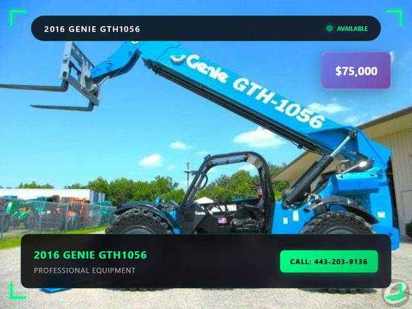 Picture 19: 2016 Genie GTH1056 Capacity: 10,000 lbs Hours: 4,783 Serial: GTH10E-11833 Condition: Used Stock: 2494 S Price: $75,000 10,000 lb capacity, 56' lift height, outriggers, 4 wdr, 3 way steer, 48", 60", or 72" forks available customer's choice, 72" fork carriage, aperture tires, Deutz diesel, 4,783 hours2016 Genieรยฎ GTHรขโยข-1056Genieรยฎ high reach telehandlers offer excellent lift capacity, easily covering all your worksite needs. Powerful features such as four-wheel drive and a turbocharged diesel engine provide reliable performance in the most rugged conditions.Key Features may include:Maximum forward reach of 42 ft (12.8 m) to move heavy loads over obstaclesTwin axle-mounted stabilizers can be deployed from the cabCompact outside turning radius and excellent ground clearanceThree selectable steering modes: front-wheel, coordinated and crab steerPowershift transmission with three speeds forward and reverseComfortable, spacious cab provides excellent visibilityMulti-function proportional joystick control for fast, precise positioningFrame-leveling chassis รขโฌโ pick up or place loads on up to 10รยฐ side slopesExpanded turbocharged diesel engine optionsPower-assisted steeringHigh-efficiency/variable displacement hydraulic pumpROPS/FOPS canopy (ISO compliant)