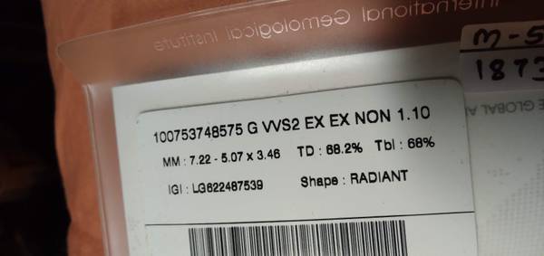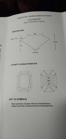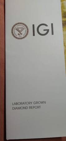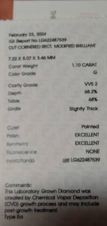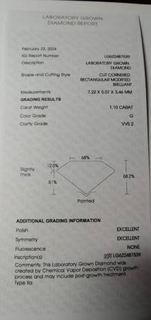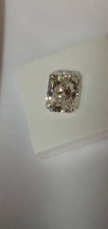 This is a Beautiful Lab-Grown Radiant Cut Diamond. An IGI (International Gemological Institute) certified diamond. It is a large 1.10 cut with VVS2 Clarity ( Very Very Slightly Included) indicates that the diamond has very minute inclusions that are extremely difficult to see even under 10X magnification, has G Color which means the diamond falls within the "near colorless" range. With the radiant cut, the light reflects are beautiful. If I could figure out how to add a movie on here you could see it's beauty. $450 B/O