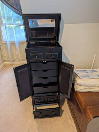 Large standing jewelry cabinet. Real wood, Pier One Imports. Top opens with mirror. Middle drawers divided and felt lined. Very nice cabinet.
