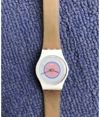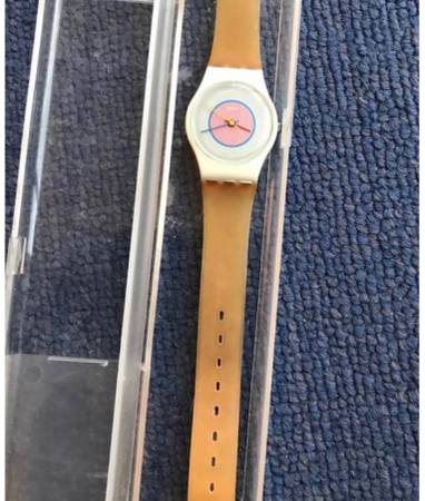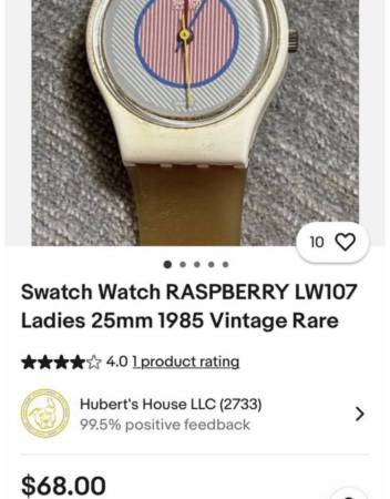 We are downsizing and offering for sale a rare vintage SWATCH strawberry scented designer watch from 1985 in original case (as shown in first three photos.) I am the original owner and this watch has always been in a smoke free household. I am asking only $50. I have attached ads selling for much more and that is not including tax and shipping. If you are interested or would like more photos, please call landline show contact info