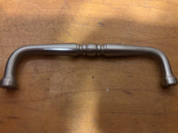 (48) satin nickel Cabinet pulls - 4" from center to center of screw holes $1 per pull, cash only Retail Price for 3" version of item is over $4 as shown in second picture