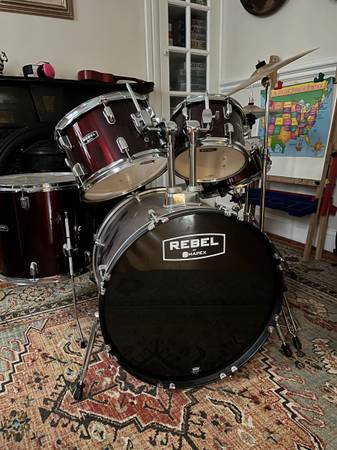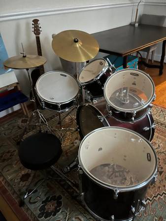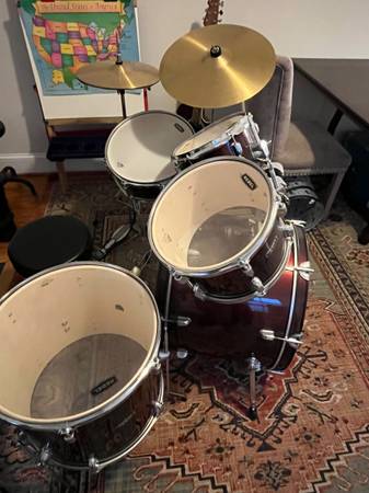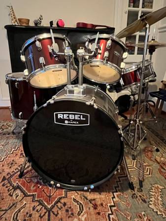 Maypex Rebel 5-piece drum set. Complete kit includes 18" Bass Drum, 10", 12", & 14" Toms, 14" Snare, Stands, Cymbals, Pedal, and Throne. Slightly used. Color is Dark Red. Already assembled. Pick...