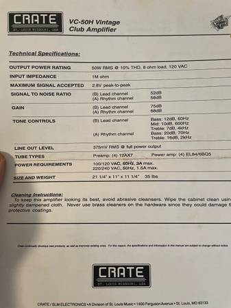 Also comes with the speaker cable to connect the cab, original instruction manual, spare 2A slo-blo fuse, and 4 extra EL84 tubes though I think one may be blown.