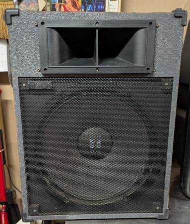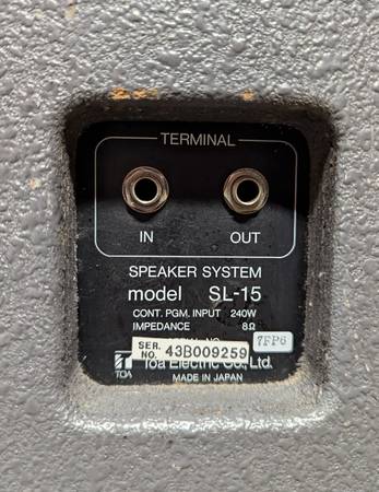 Pair of TOA SL-15 pa speaker systems. Items are used, work perfectly, 240W, 8 ohms, crossover 5K, sensitivity 98dB (1W/1m), 70hz -20Khz, 15" woofer, stand mount on bottoms, each weighs 35 lbs., size 23" x 17" x 12" and solid wood cabs with average wear as shown in actual photos.