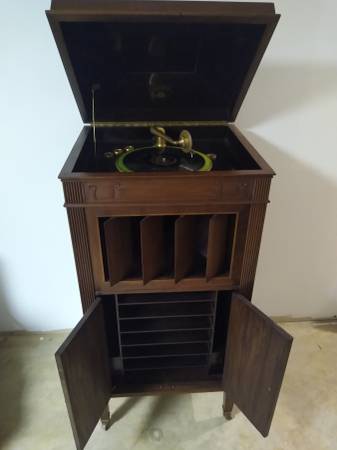 2 nice hand crank Columbia Grafonola s in nice working condition. Dark and light mahogany wood. Plays the 78 rpm records. $300 each
