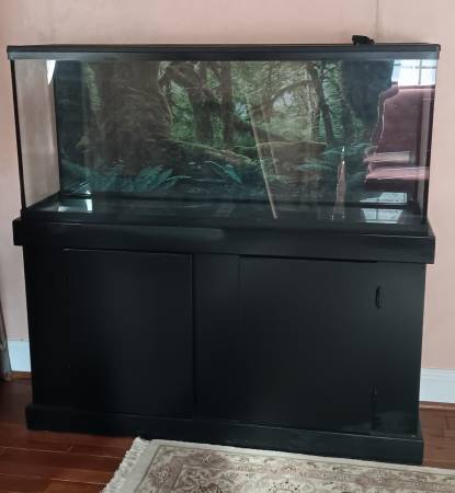 55 gallon fish tank and stand. Used for both fish and reptiles previously. Has a screen lid, some heat lamps, and a power cord. Also included: LED bar lights and glass screen lids. Would be perfect Christmas gift for someone wanting to get into fish/reptile keeping.