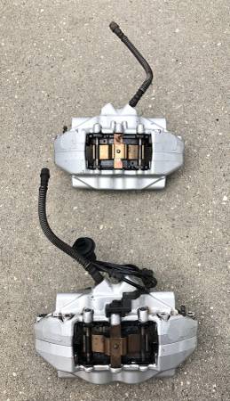 Selling a pair of rear Brembo brake calipers removed from a Mercedes S600 (w220). They have new Akebono brake pads, and Zimmerman rotors. $450 for the calipers/pads $75 for the rotors