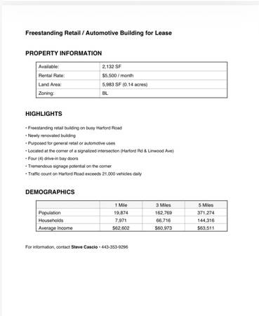 Very busy corner in Parkville Md with a traffic light. Great location for auto repair /tires . Contractor office with storage . Many uses . Very high visibility