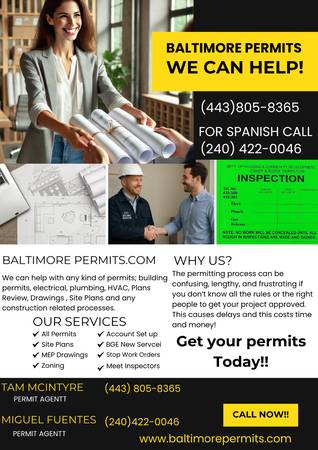 All Permits, Electrical, Building, Plumbing, Drawings, Site Plans, MEP (Baltimore City and Baltimore County)