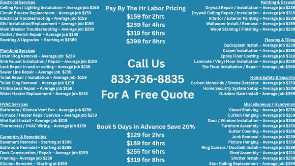 Our team offer affordable discount services in Plumbing, Electrical, HVAC, Drywall, Painting, Trim work, Exterior work, Appliance Repair, and more by phone (1833-RENTTEK) or our website (www.rentatech.org) while specializing in Home Energy Efficiency. We handle new installs as well as remodels. No job is too big or too small. Don't put your home in the hands of one guy hire a whole team instead! If you need to find A , Cleaner, Drywall Pro, Electrician, Handyman, Laborer, Roofer, Floor Tech, Tile Installer, Furniture Assembly, Helper, Landscaper, Painter, Or Plumber near me / near you then look no further! We have them and where available 24/7/365!