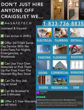 Our licensed S.A.F.E.T.E.C.H. (Safety & Training Certified) pros handle plumbing, electrical, drywall, painting, and more with 24/7 same-day availability and no extra cost for nights or weekends.
