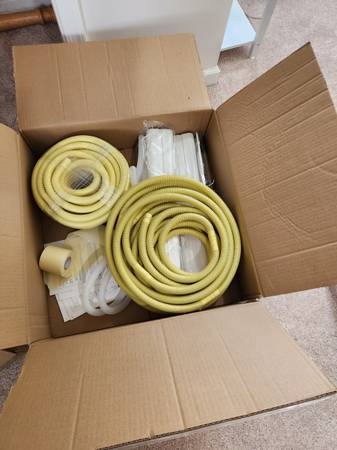 2x 15' unused mini split line set ,1/4" and 3/8", Another 2 roll about 20 ft each and 1 or 2 broken ones. Have 3 dripping hose and 2 15' electric wire. Covering box etc.