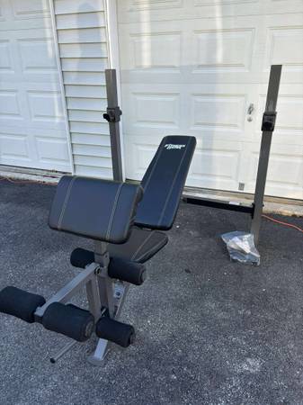 Adjustable bench with squat rack and leg extension. Adaptor for 2” plates.