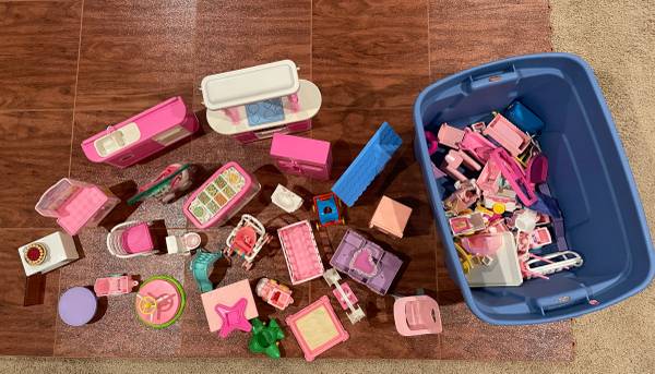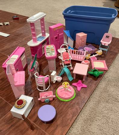Barbie Daycare includes stroller, sandbox, changing table, slide, train and cradle.