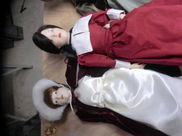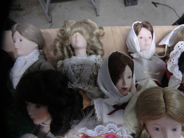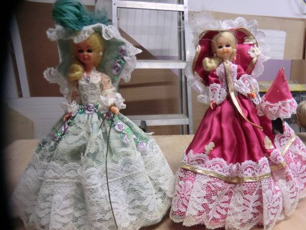 See pictures. Price is for one doll but steep discount on multiples. Smaller dolls are less From adult collection under glass or in a box for most of their lives I believe the larger ones in the theme outfits are porcelan. I do not know who made theme are when. They look old fashion but I doubt it since they are clean and not faded. most are excellent
