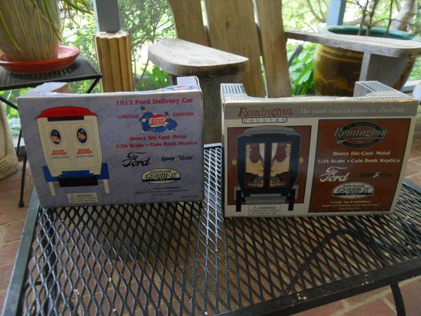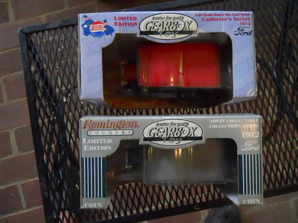 2 Gearbox die-cast metal toy trucks / banks. Limited Editions, both 1:24 scale. Both are brand new in box. They are: 1) 1912 Ford Model T Delivery Truck - "Remington Country" (1999) 2) 1912 Ford...