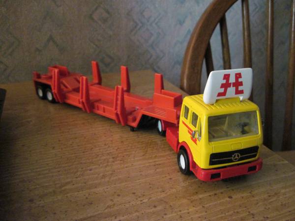 Vintage 1980 Lesley Mercedes Tractor w/log trailer. Metal construction tractor and base of trailer. 2 pc. set, truck cab folds forward like real tractors, air vent on top folds up. All windows are in tact as well as side mirrors and steering wheel in sealed cabin. Trailer has metal base and plastic top, slides and locks into tractor. Truck measure 4-1/4" long x 2" x 2-1/4" high. Trailer measures 9" long x 2-1/2" wide. Great condition. $15.00