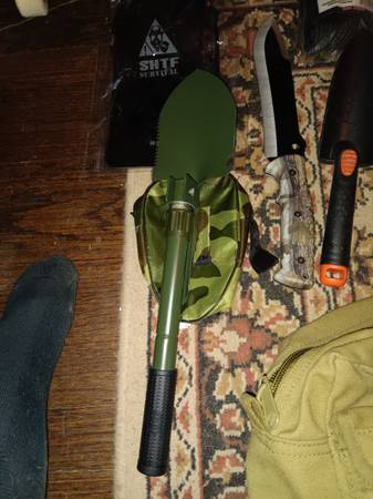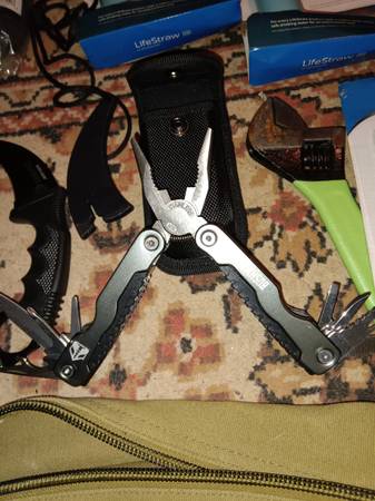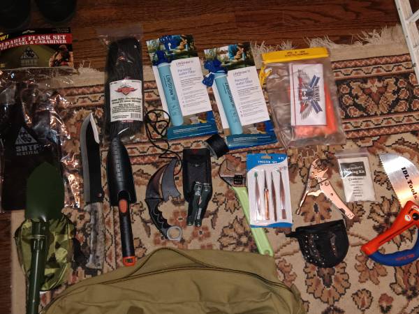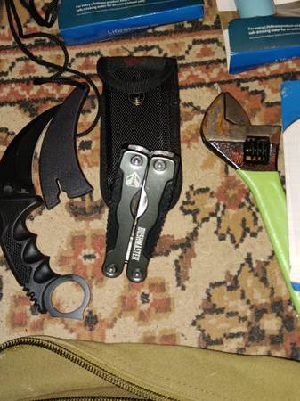 Camping and survival kit #2 items are: foldable flasks, braided 550 cord/rope, 2 personal water filters, Haeke survival mini kit, folding shovels, large knife, Darwin- black legion curved knife, bushmaster all in one tool, adjustable wrench, tweezers set, vice grips, fishing kit, 2 folding saw, and OD green carring bag, all for $55.... If interested Text me at show contact info