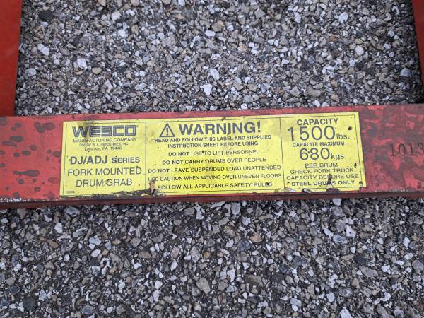 I have a used Wesco DJ/ADJ Series Fork Mounted Drum Grab for sale. 1500 Pound Capacity. $200 Cash only. Please leave your name and number if you want to buy it.