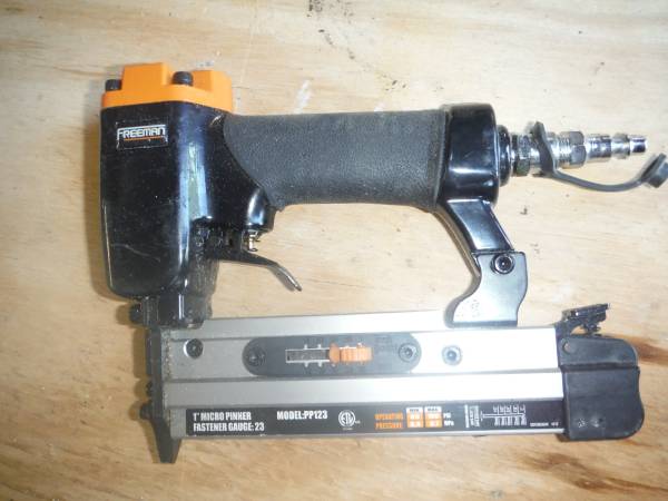 FREEMAN 23-Gauge Pneumatic Pin Nailer Model PP123 Great for custom applications such as crafts, tracking decorative trim, small picture frames, hobby work, jewelry cases, detailed trim and customer work. Uses 23-Gauge headless pin nails ranging from 1/2-in to 1-in pins. Pin size selector allows the user to determine the fastener size Excellent condition rarely used. first $20 Cash takes it home Call Robb