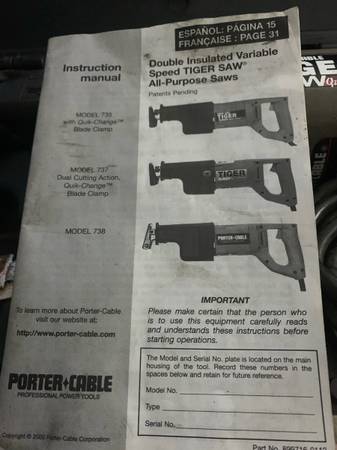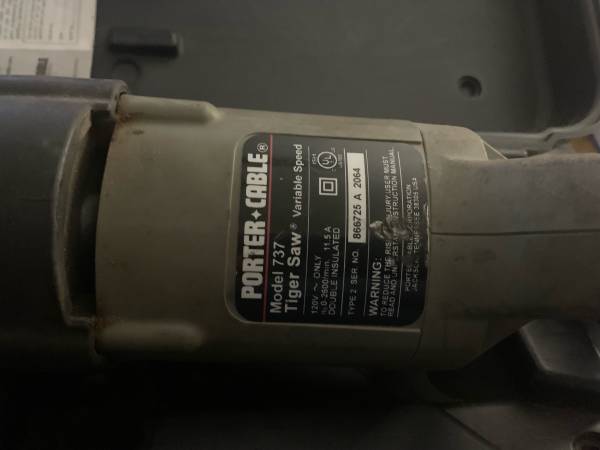 Porter Cable tiger saw. Variable speed , quick change blade chuck, no tool needed. Straight cut or orbital. Carrying case and manual. Runs great , very powerful. 2-3 blades included. Cash only