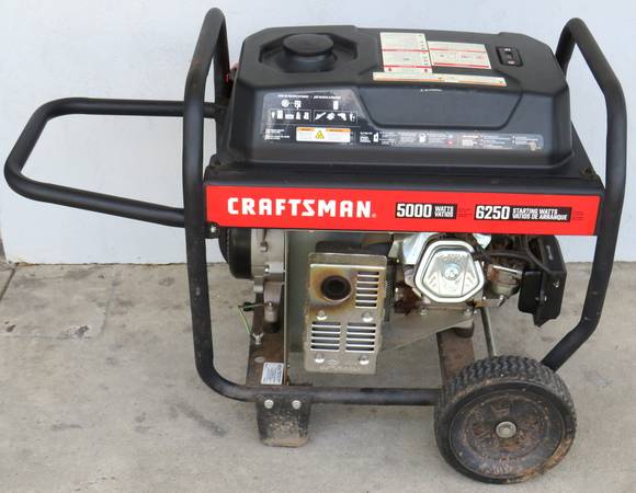 For sale I have a Craftsman 6250/5000w generator. There are some scuffs/ rust spots on the generator from use. The bottom frame has broken and the generator sits on an angle. It is in good working condition and can still be wheeled around. This generator retails for $699 plus tax! If you have any further questions please feel free to ask!
