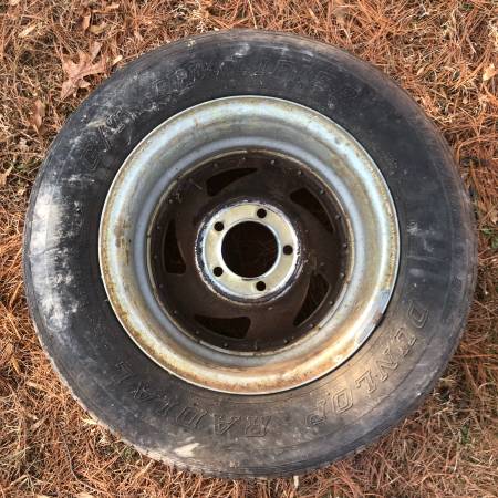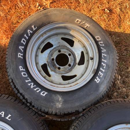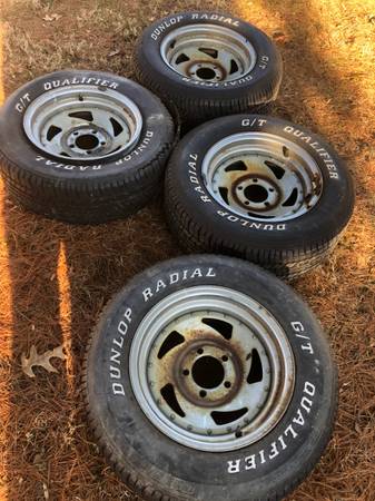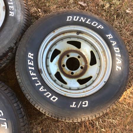 four 14” steel sawblade rims with old school Dunlop G/T Qualifier white lettered tires. These were removed from a 1969 Ford Mustang, so the bolt pattern is 5x4.5”. 5 lug Rims have rust, one tire has...